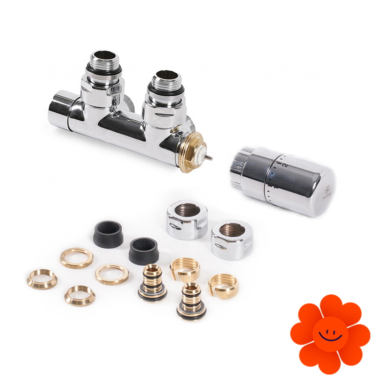 Stredová rohová ľavá termostatická dizajnová sada obsahuje: integrovaný termostatický stredový ventil, termostatickú hlavicu SLIM, adaptéry AL-PEX ∅ 16x2 a meď ∅ 15.
