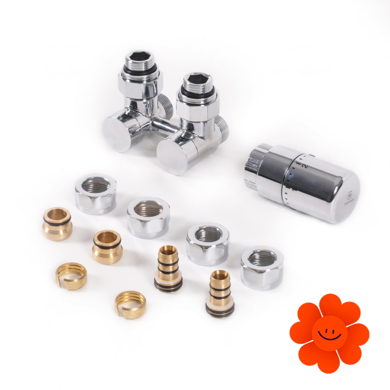 Rohová termostatická stredová sada obsahuje: termostatický ventil, uzatvárací ventil, termostatickú hlavicu SLIM, adaptéry AL-PEX ∅ 16x2, meď ∅ 15 a redukciu na závit G 1/2".