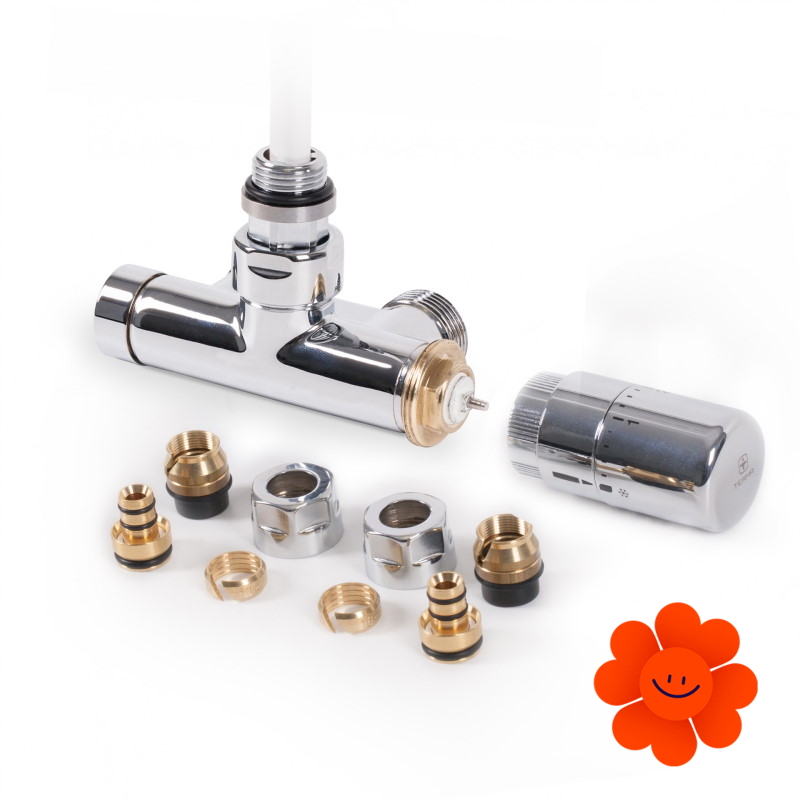 Ľavá termostatická rohová sada obsahuje: termostatický ventil, uzatvárací ventil, termostatickú hlavicu SLIM, adaptéry AL-PEX ∅ 16x2 a meď ∅ 15.
