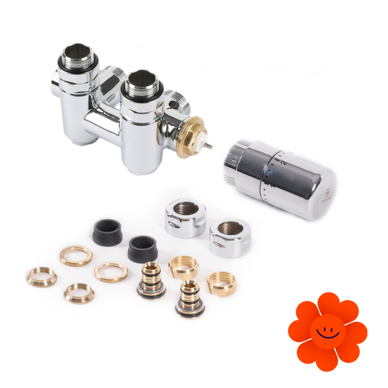 Ľavá termostatická stredová sada obsahuje: termostatický ventil, uzatvárací ventil, termostatickú hlavicu SLIM, adaptéry AL-PEX ∅ 16x2 a meď ∅ 15.