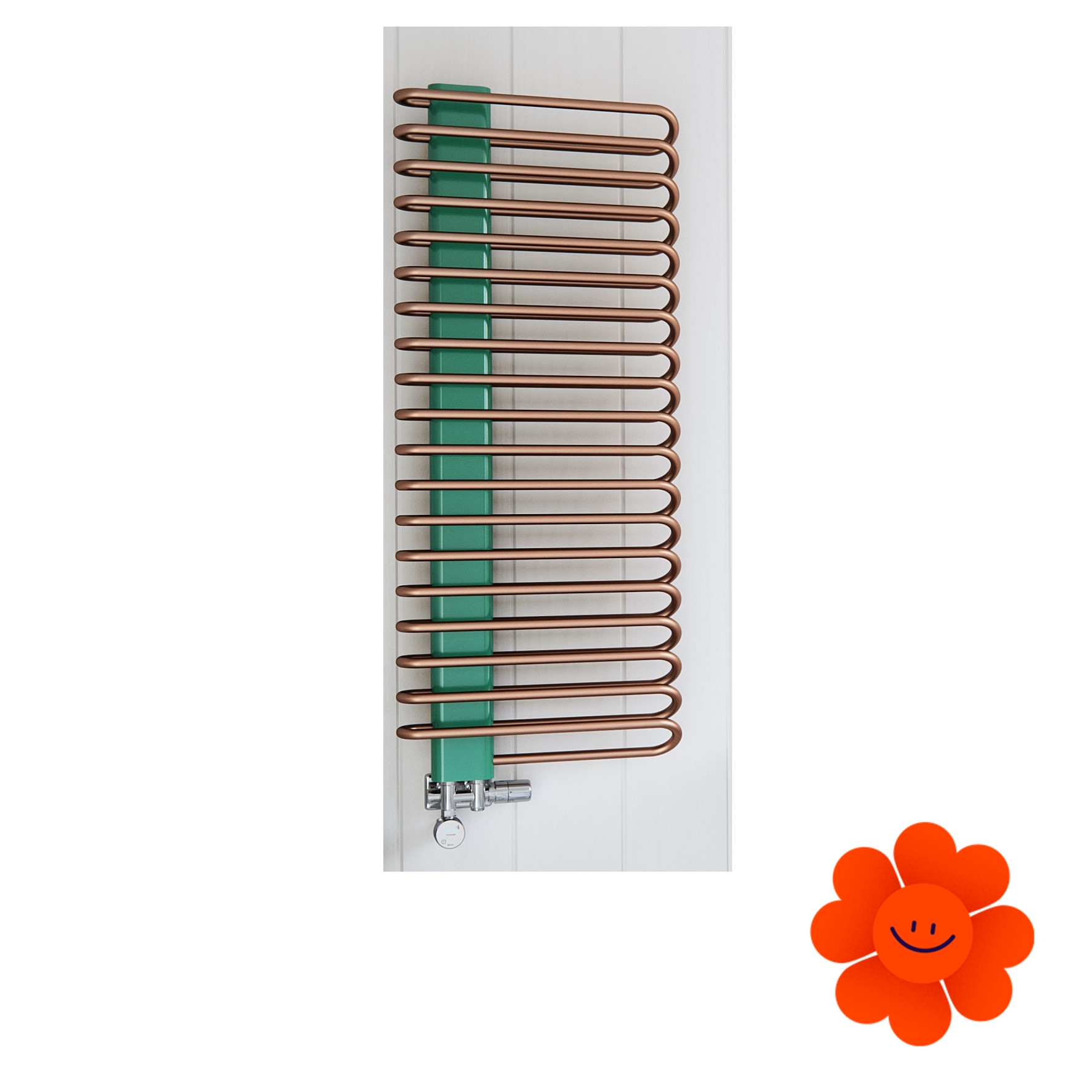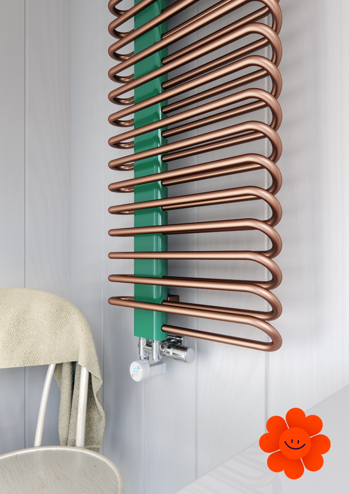 Moderná alternatíva klasického trubkového radiátora do kúpeľne. Asymetricky umiestnený kolektor a zaujímavo špirálovite zakrivené profily tvoria priestorové, otvorené teleso.