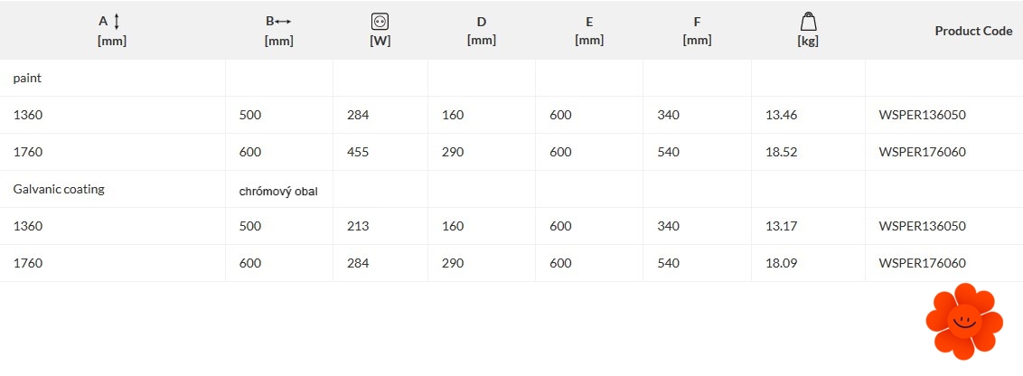 Dostupný v dvoch veľkostiach, v rozličných farebných verziách, okrem elektrického ohrievača aj vo verzii vody - radiátor TERMA Perla. Výkon: 284-455W.
