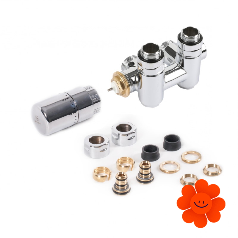 Pravá termostatická stredová sada obsahuje: termostatický ventil, uzatvárací ventil, termostatickú hlavicu SLIM, adaptéry AL-PEX ∅ 16x2 a meď ∅ 15.