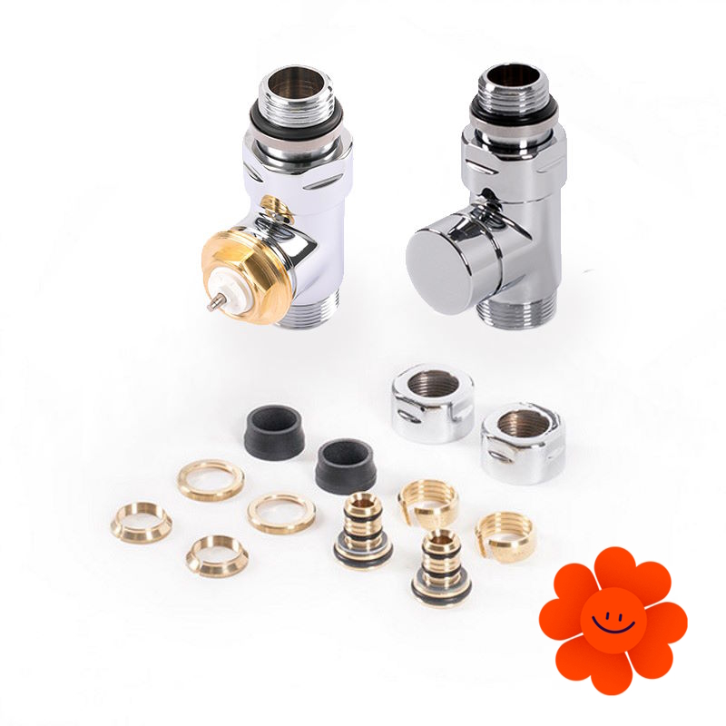 Priama termostatická dizajnová sada obsahuje: termostatický ventil, uzatvárací ventil, adaptéry AL-PEX ∅ 16x2 a meď ∅ 15.