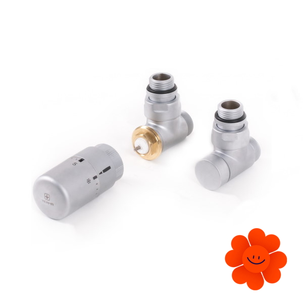 Rohová termostatická dizajnová sada obsahuje: termostatický ventil, uzatvárací ventil, termostatickú hlavicu SLIM, adaptéry AL-PEX ∅ 16x2 a meď ∅ 15.