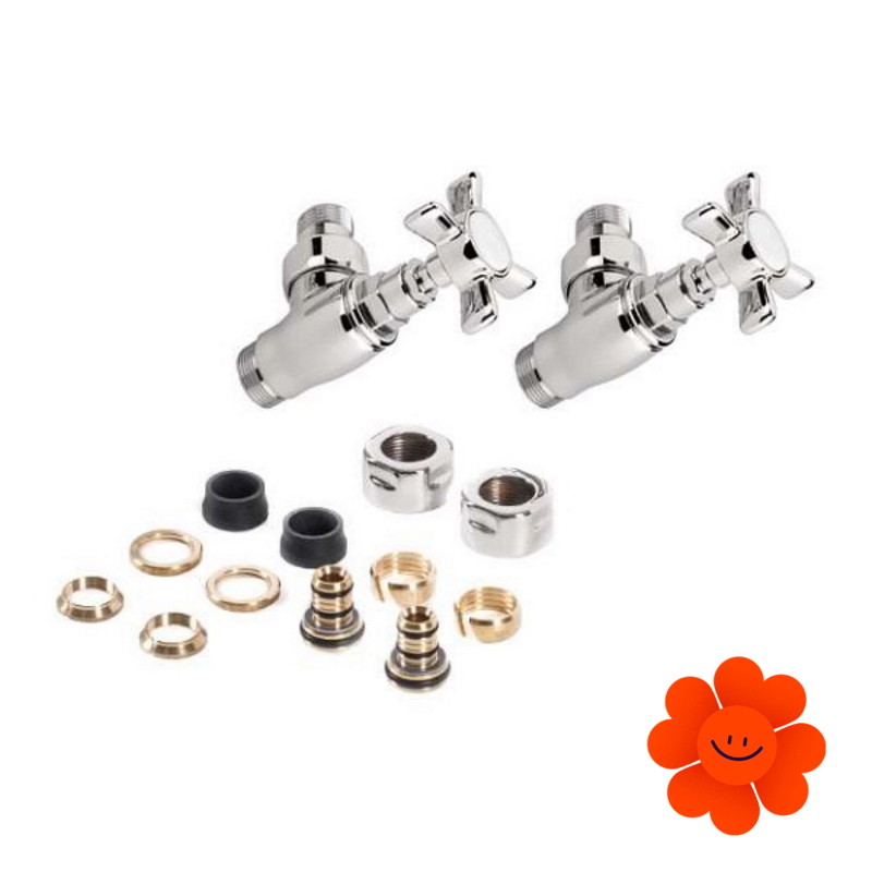 Rohová manuálna dizajnová sada obsahuje: regulačný ventil, uzatvárací ventil, adaptéry AL-PEX ∅ 16x2 a meď ∅ 15.