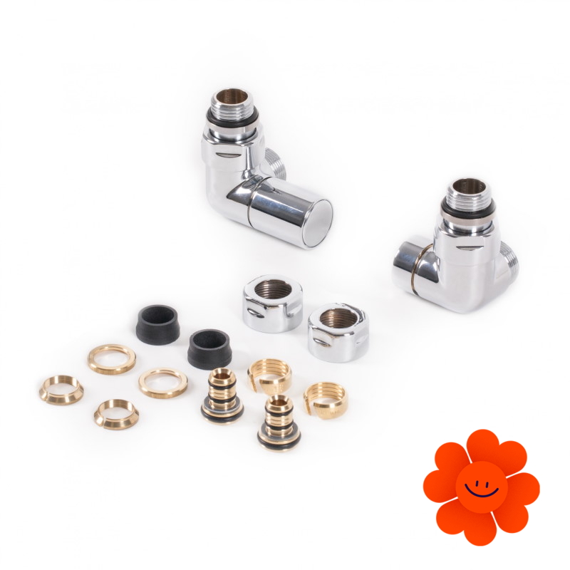 Ľavá manuálna uhlová sada obsahuje: regulačný ventil, uzatvárací ventil, adaptéry AL-PEX ∅ 16x2 a meď ∅ 15.