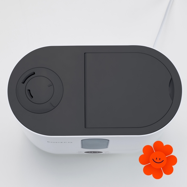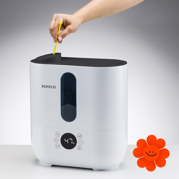 Zvlhčovač možno naplniť vodou bezdotykovo z hornej časti. Je ovládaný pomocou LED displeja. Režim "AUTO" automaticky zvlhčuje vzduch v miestnosti do optimálnej relatívnej vlhkosti 50%. Táto hodnota sa meria pomocou vstavaného vlhkomeru a možno ju nastaviť aj manuálne podľa potreby.